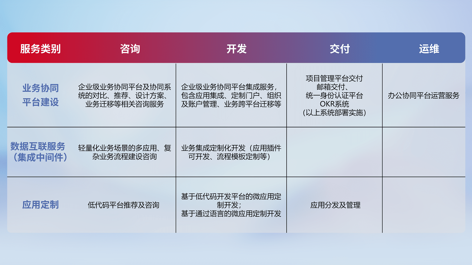 针对钉钉、、、企微、、、IDaas等平台级产品提供产品的规划、、、、方案、、交付、、、、定制化开发等服务,,实现如统一协同办公、、智能客户服务、、、混合会议管理、、、智能数据查询、、、等业务场景,,,,实现数字化转型。。